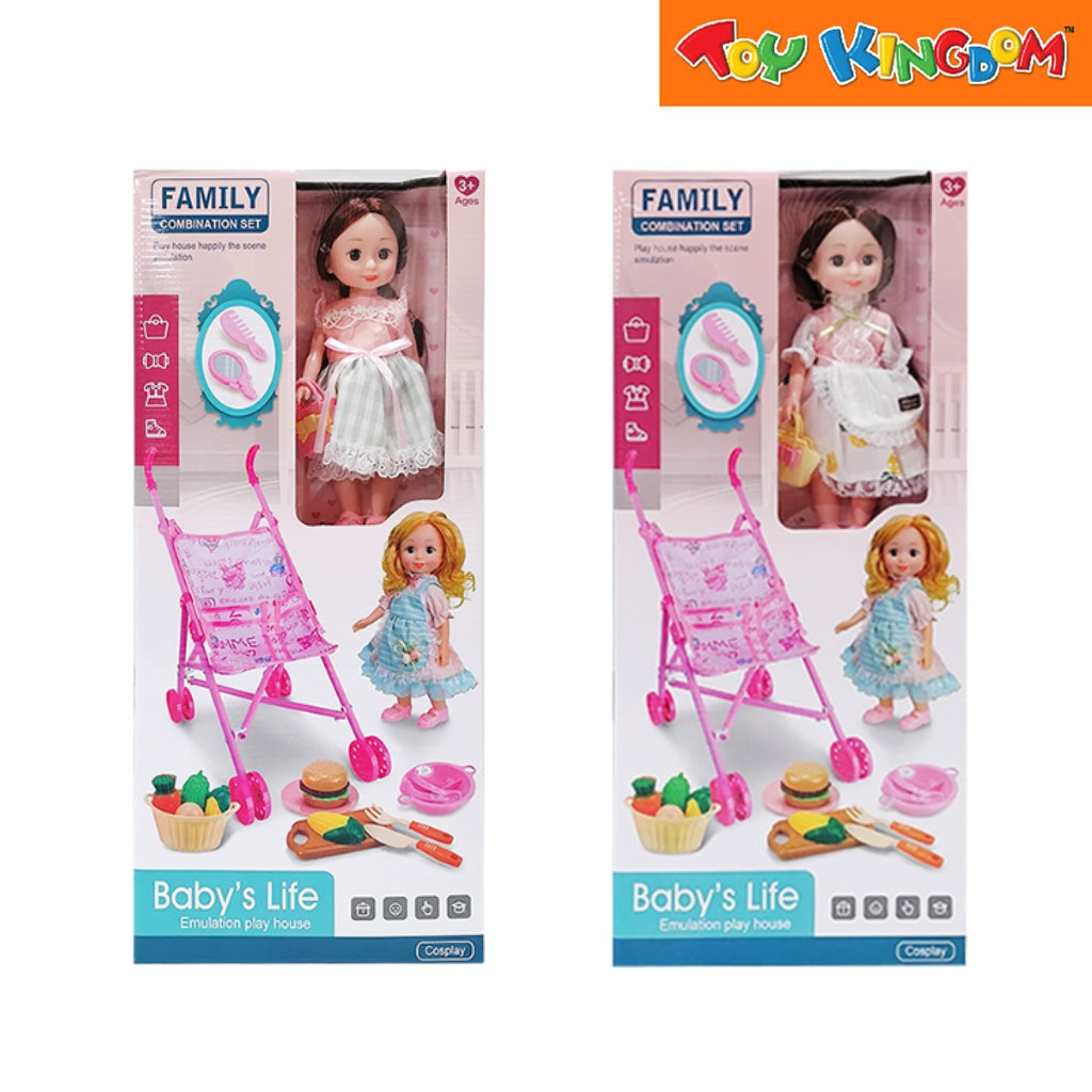 The set includes a 12-inch fashion doll and a pink foldable baby stroller.