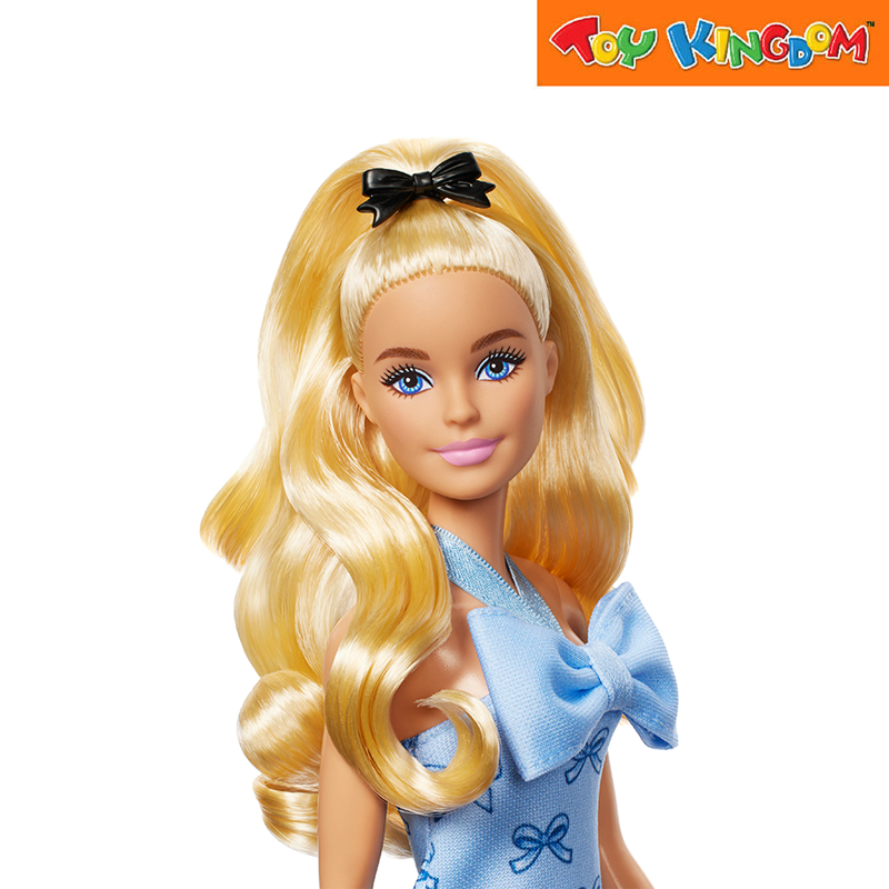 Barbie doll wears her long blonde hair in a bouncy ponytail! It's topped by a black hair bow accessory that expresses her sweet personality.