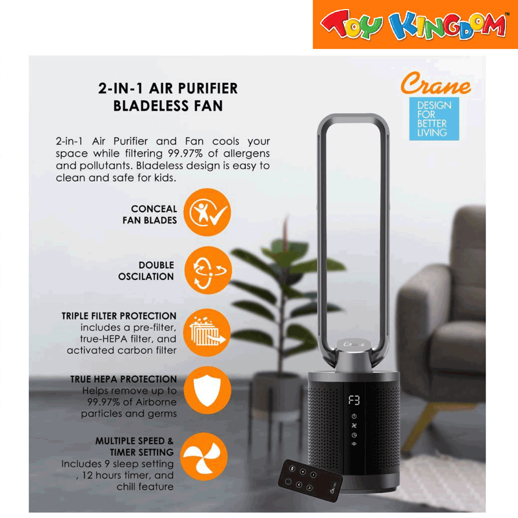 2 in 1 Air Purifier and fan cools your space while filtering 99.79% of allergens and pollutants. Triple filter protection: includes a pre-filter, true hepa filter and active carbon filter. True Hepa protection: helps remove 99.97% of airborne particles and germs.Multiple setting: Include 9 sleep setings, 2 hours timer and chill feature. Room Capacity: 20-30sqm.