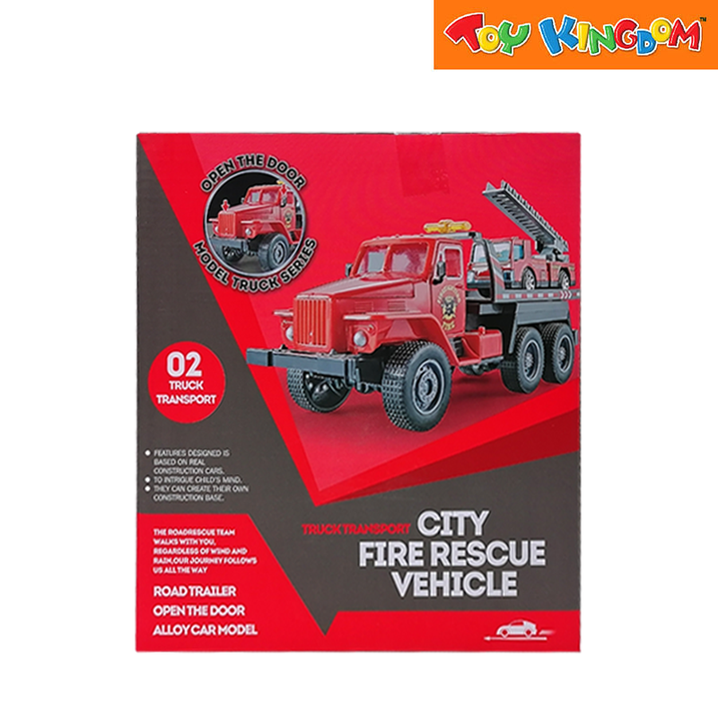 The set features a larger transport truck/trailer along with several mini rescue vehicles.