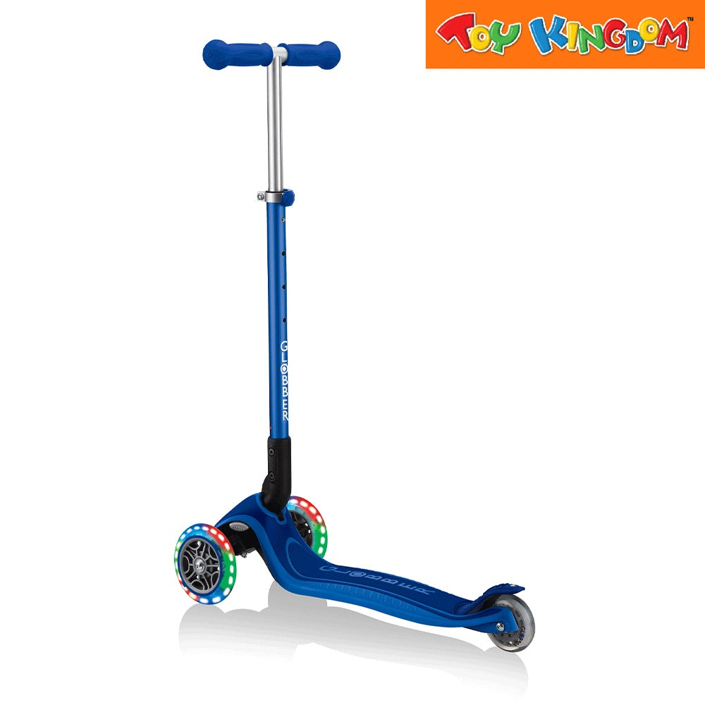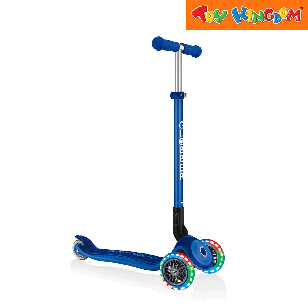 Globber’s Primo Foldable Prime Lights is an award-winning 3-wheel foldable scooter with light-up scooter wheels for kids aged 3 to 9+, allowing kids to enjoy fun, glow-tastic scooter rides!Globber's patented folding mechanism with a push button; folding a scooter is fast & easy! With just a push of a button, it folds to easily carry the scooter in trolley mode and conveniently store it away after playtime!Adjustable scooter, coming with a 4-height adjustable aluminium anodized T-bar 67.5, 72.5, 77.5, 82.5cm from the ground with comfortable TPR ergonomic grips, delivering maximum product usage and comfort as your child grows!What’s more, the foldable kids’ scooter comes with a wide, anti-slip and super-low reinforced deck design, which supports up to 50kg, and an extra-long & wide, integrated rear brake, for your child to easily place two feet on the scooter deck and safely scoot for hours!It comes with Globber's patented steering lock button, which fixes the steering system of the two front wheels to only move forward and backward, helping to teach children how to balance on a scooter in no time!Thanks to Primo Foldable Prime Lights’ 121mm battery-free LED front wheels, which flash in red, green and blue, your little one can enjoy glowtastic rides for hours! The wheels are battery-free thanks to dynamo lighting integrated in the front wheels’ core. The faster your child scoots, the brighter the lights appear!