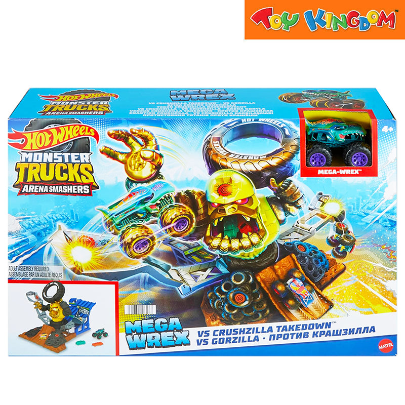 The set includes 1 Hot Wheels Monster Trucks Mega-Wrex in 1:64 scale and 2 destructible cars that children can place in the stands or feed to Crushzilla.