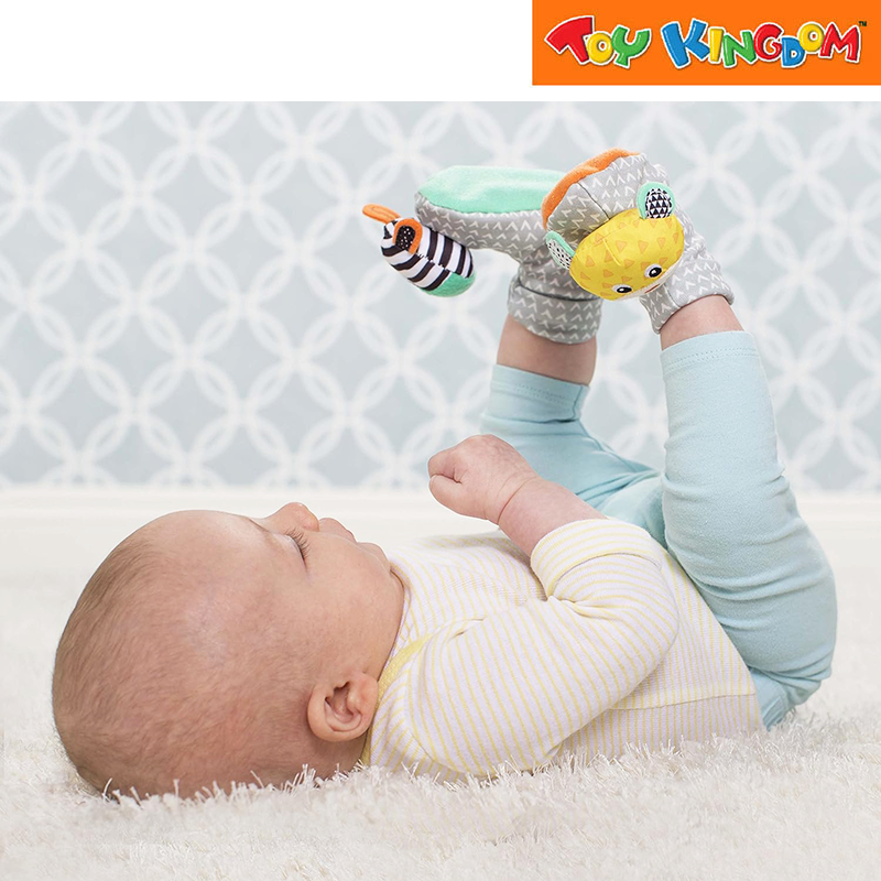 Suitable for ages 0 months and up 2 foot rattles are included Easy to slip on and off Encourage kicking & grabbing Teach cause & effect Color and packaging design may vary