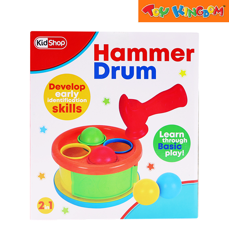 A child friendly drum toy that comes with a small hammer — letting kids tap or pound to make drum sounds.