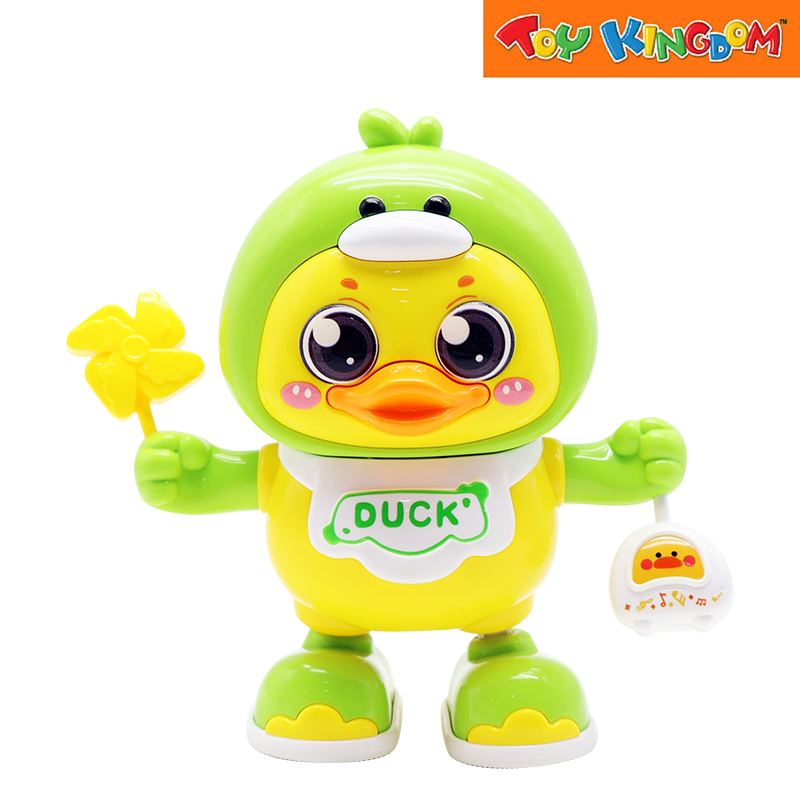 Colorful dancing duck designed to move (waddle, spin or sway), ideal for entertaining toddlers and preschool children.