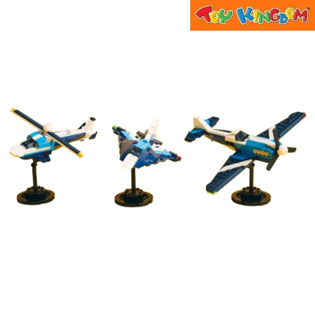 Kids can stage aerial adventures with 3 different vehicle building options (models cannot be built simultaneously): a Race Plane toy, a jet plane toy and a helicopter model.