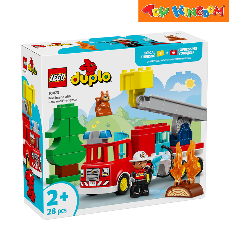 Toddlers ages 2 plus grow their imagination inventing exciting stories about tackling a fire with the LEGO® DUPLO® Town Fire Truck with Hose and Firefighter (10473) playset