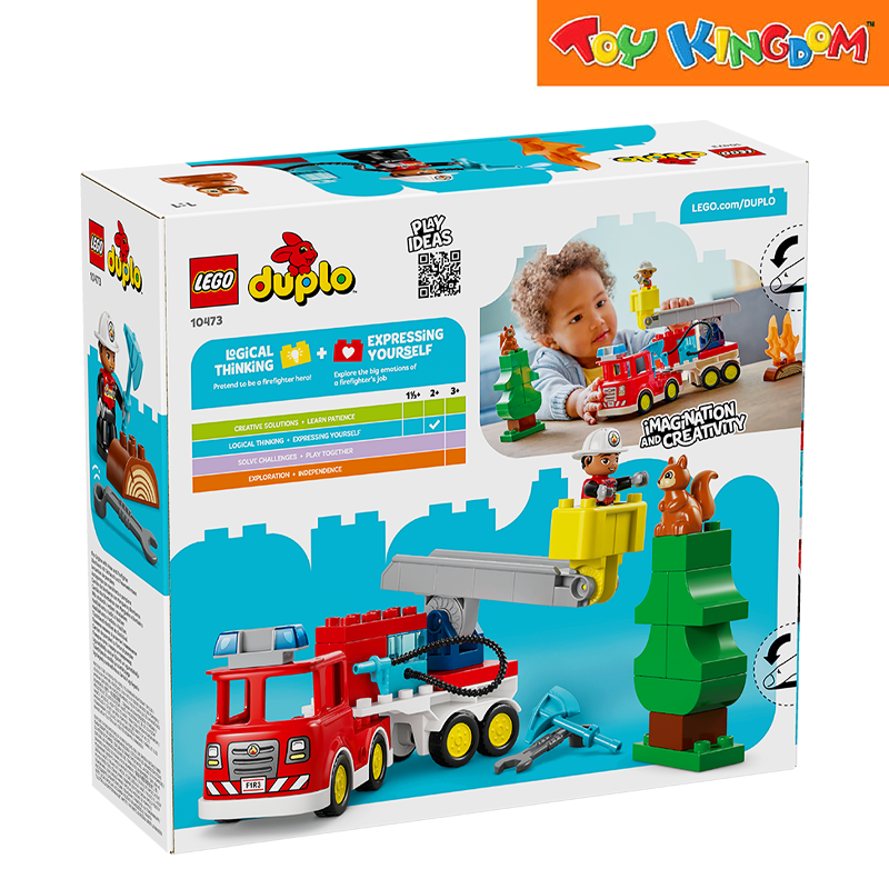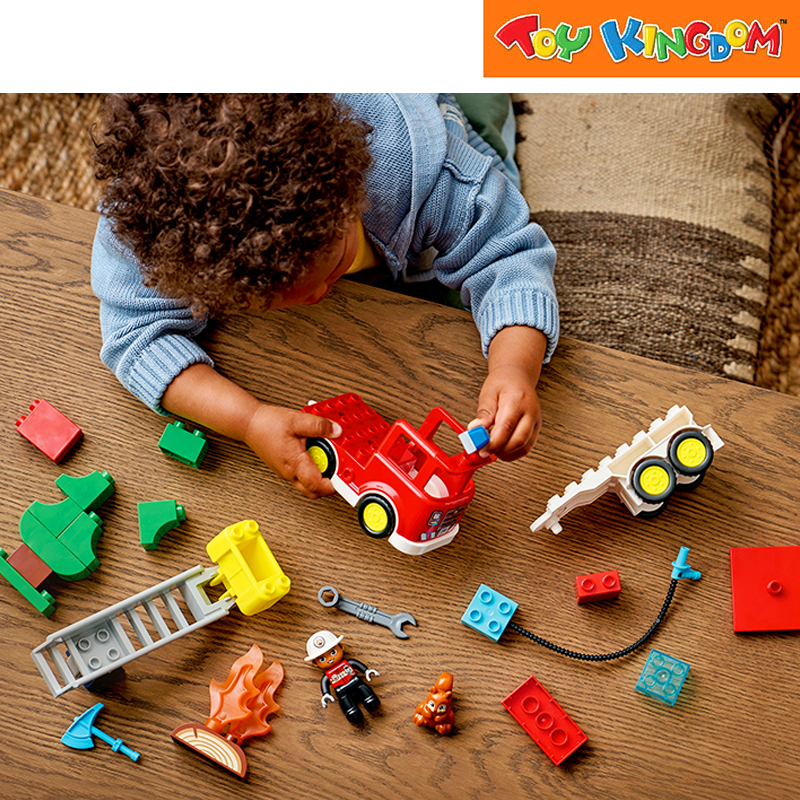 Includes a fire truck model with detachable trailer, a firefighter figure, LEGO® DUPLO® squirrel, axe and wrench to encourage imaginative save-the-day play