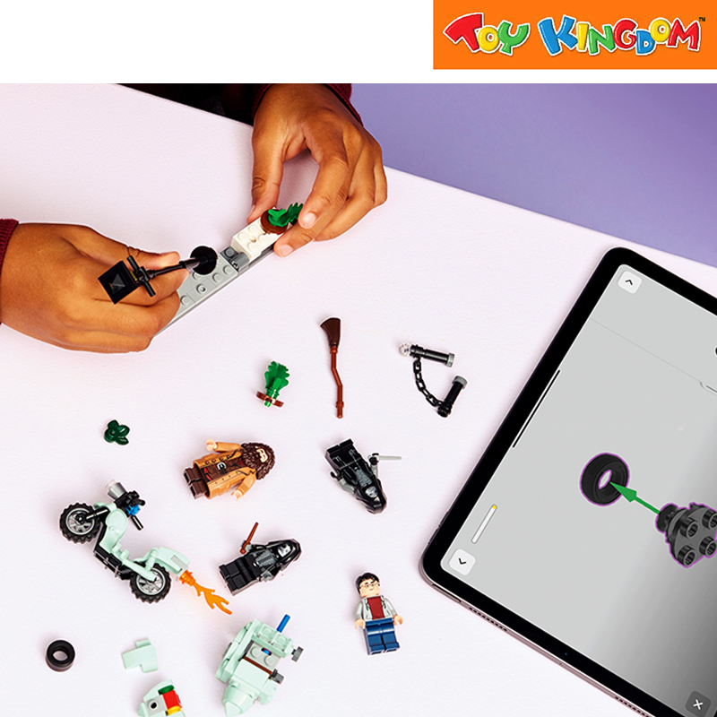 Place Rubeus Hagrid™ on the first minifigure-scale LEGO® model of his flying motorcycle with Harry Potter™ in the sidecar