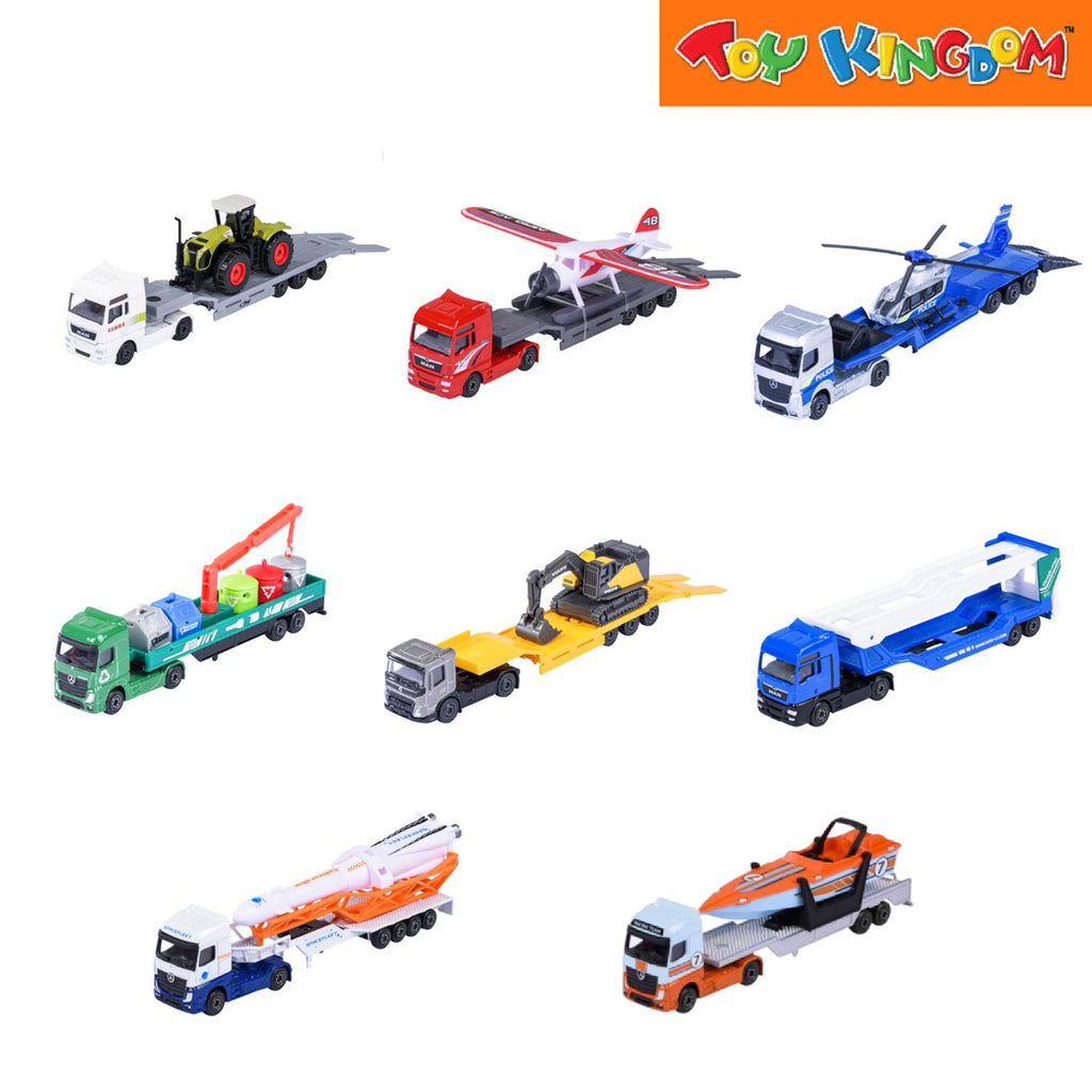 Each truck comes with spectacular accessories: boat, helicopter, excavator, or even a rocket!