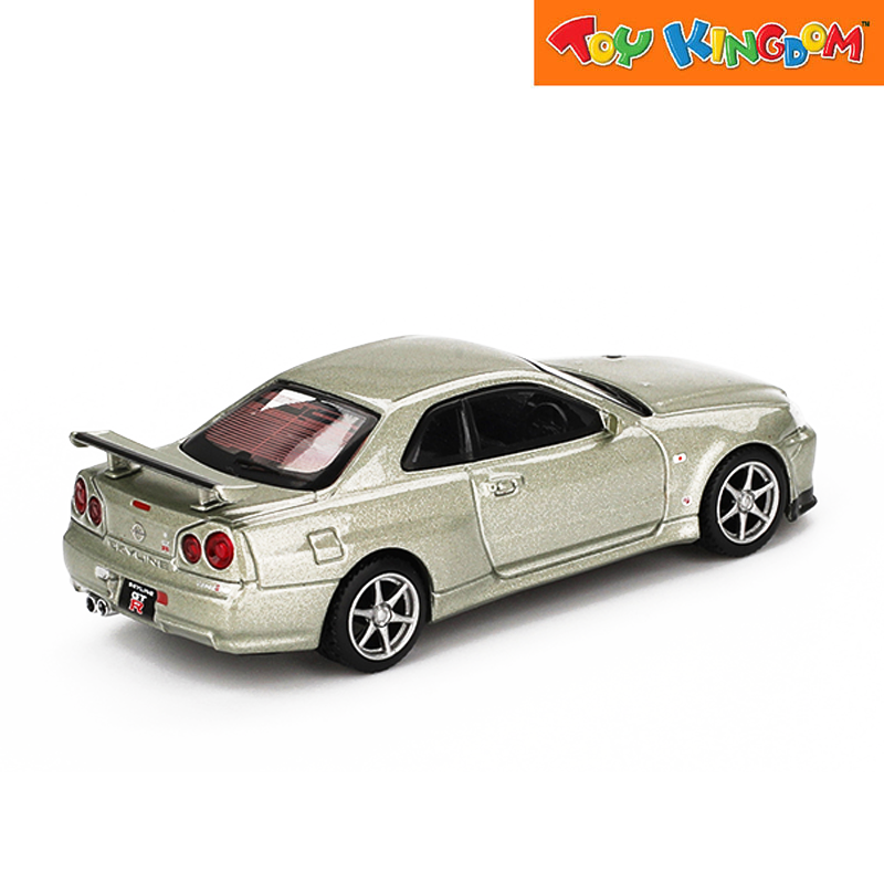 This Mini GT model pays homage to the legendary R34 GT-R V-Spec II Nür, finished in the rare and iconic Millennium Jade color