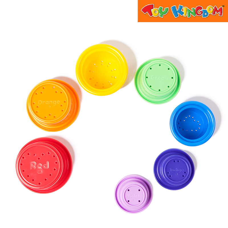 Each color’s name is embossed on the bottom of the cup to encourage littles as you play and stack the colors of the rainbow