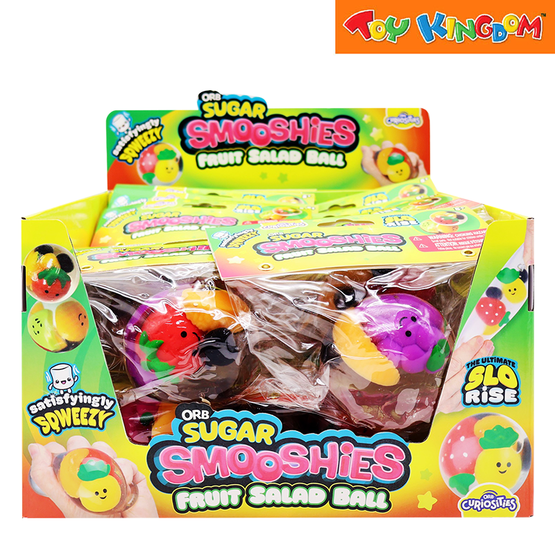 - A colorful squishy ball filled with fruit-themed Sugar Smooshies for fun sensory play.