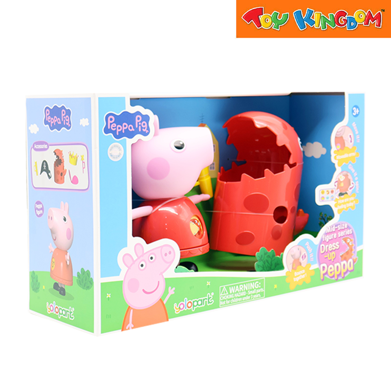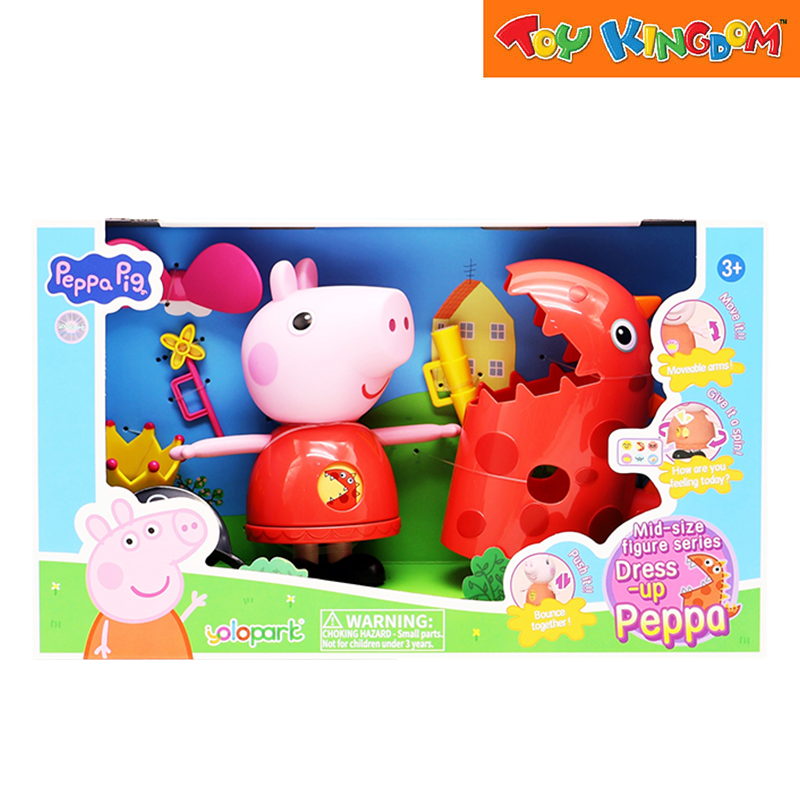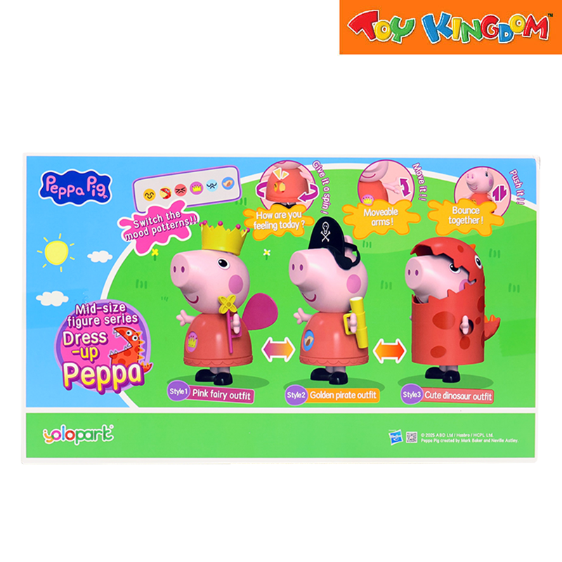 Comes with multiple interchangeable outfits (e.g. fairy outfit, pirate outfit, dinosaur outfit) — letting children dress up Peppa in different costumes for imaginative, creative play.