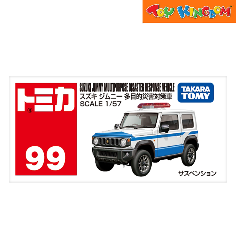 The Tomica No. 99 Suzuki Jimny Multi-Purpose Disaster Response Vehicle is a 1/57 scale die-cast replica designed for imaginative play and collecting, featuring working suspension.