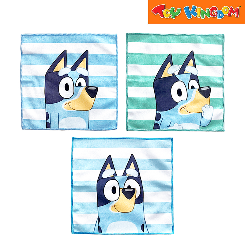Recommended for ages 3 years and up. 3 Microfiber Face Towels Size: 16 x 21 cm each Designs: Bluey Stripe, Bluey Green Stripe, Bluey Double Smile Color and Packaging may vary