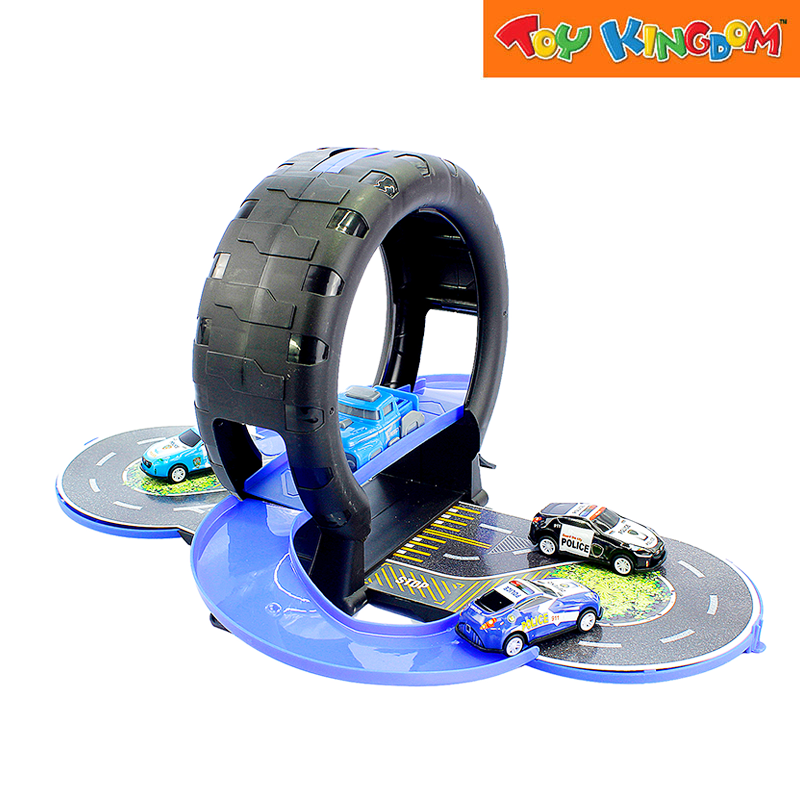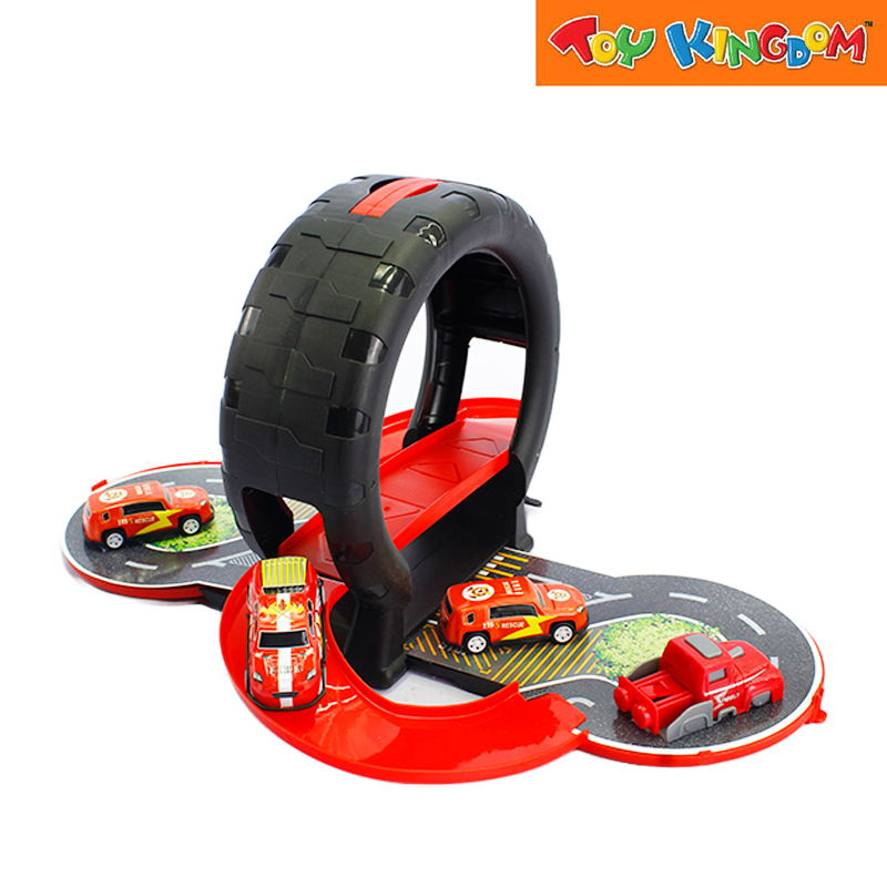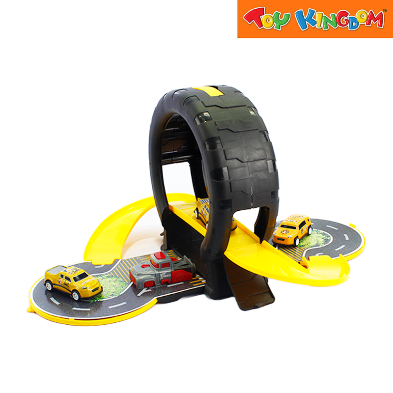 2 in 1 Transformable Tire – Unique tire design unfolds into a complete parking garage playset