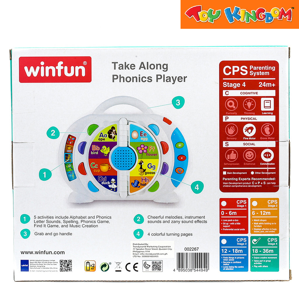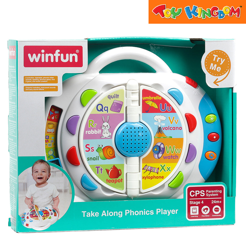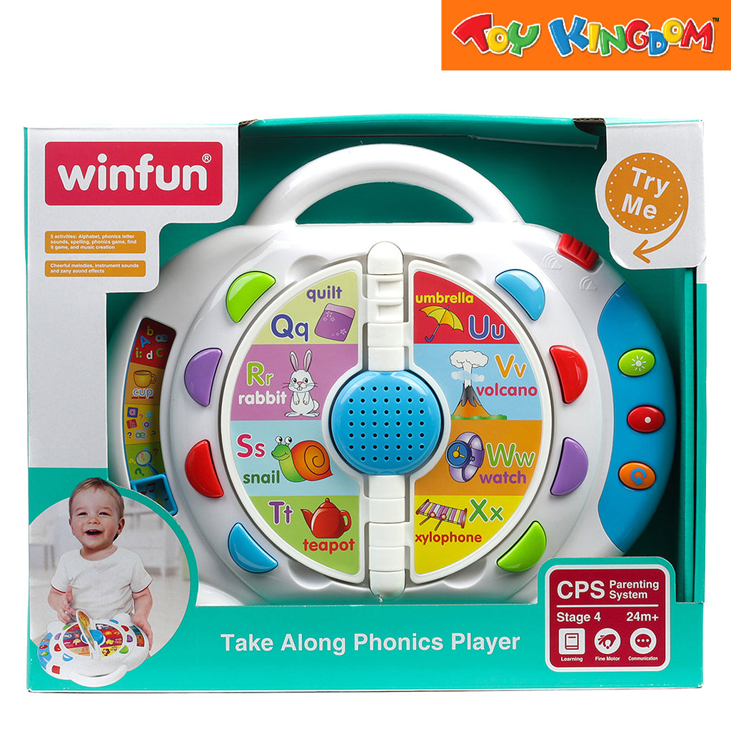 • 5 activities including Alphabet and Phonics Letter sound, spelling, Phonics game, Find it game, and Music creation. With Grab and Go Handle. Cheerful Melodies, instrument sounds and zany sound effects. 4 colorful turning pages.